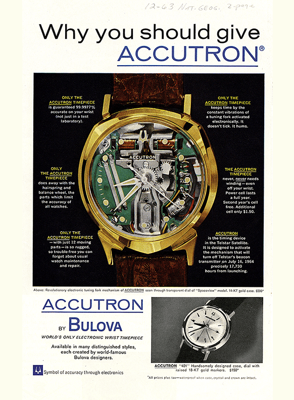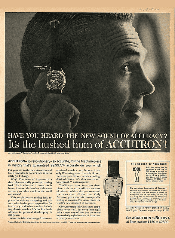 この音叉式アキュトロンの基礎技術は、アメリカの宇宙開発計画を支え、アキュトロンのロゴは、正確な計時を求める消費者のシンボルとなりました。