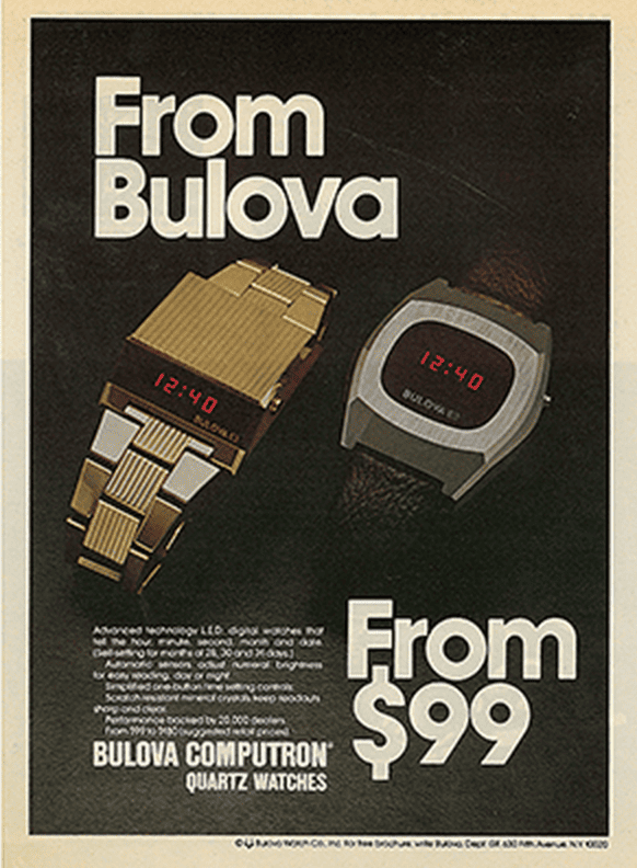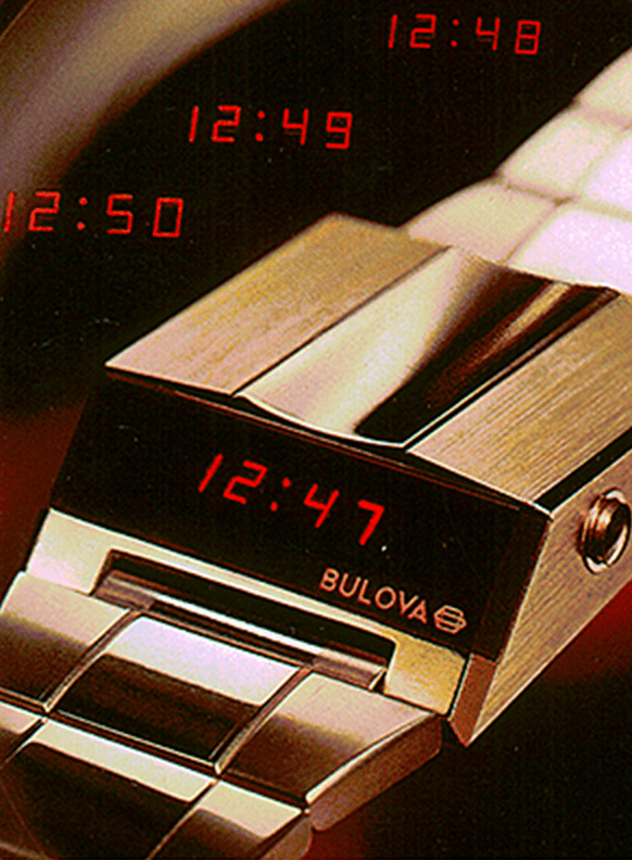 1962年に発明されたLED(発光ダイオード)は、小型で高輝度の新技術として注目を浴び、家庭用電化製品や電車内の案内板に利用されるようになりました。その技術を基に、ブローバはデジタル表示とクォーツムーブメントを組み合わせた新しい時計「コンピュートロン」を開発しました。
