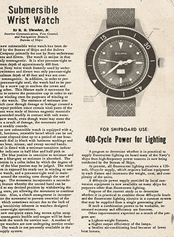 1957年に米海軍潜水実験隊へ提供した、歴史的に希少な水中時計のプロトタイプ【MIL-SHIPS-W-2181潜水用】。海軍に待ち望まれながらも開発を中止した伝説の高機能水中時計です。