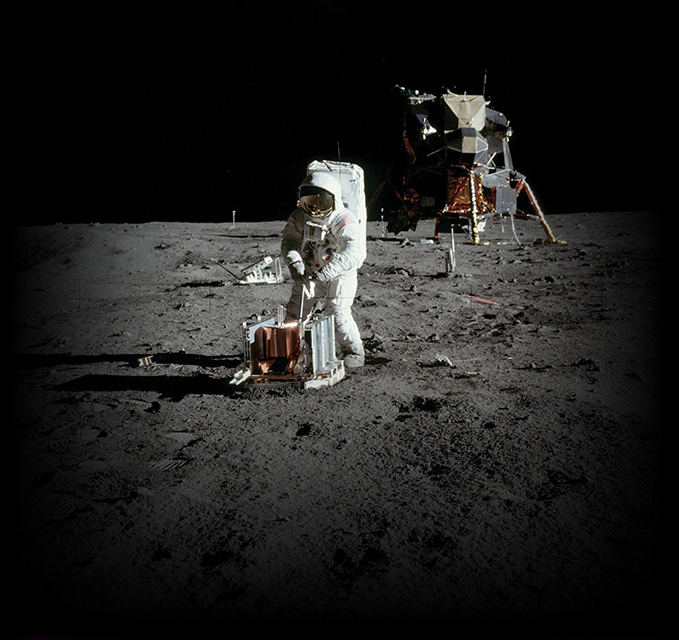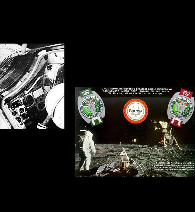 常に革新性を求めるブローバは、未知の領域へと挑む NASAの研究者や宇宙飛行士たちに惜しみない声援を送り、彼らの活動に資する製品を開発しました。1969年、人類初の月面着陸を果たした宇宙船アポロ11号にはブローバ製計時装置が積み込まれ、観測を終えた今でも Sea of Tranquilty (静かの海) に設置されています。