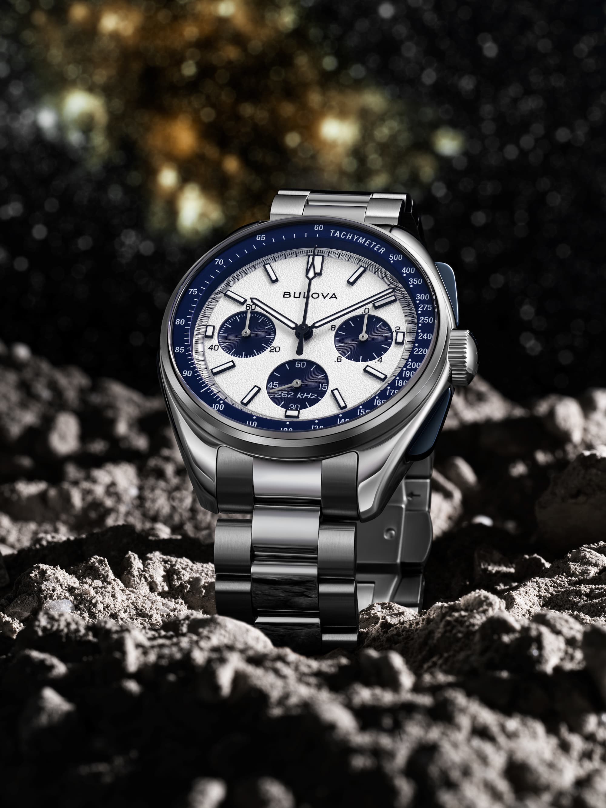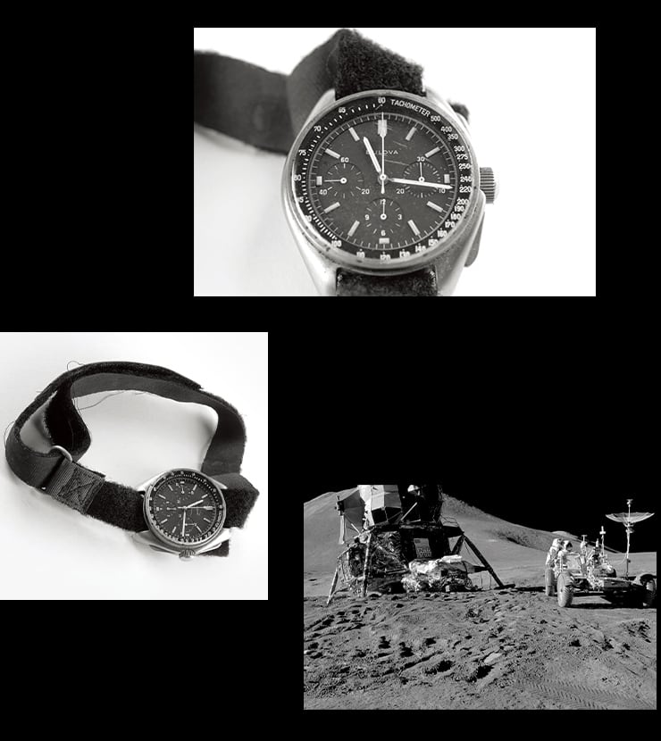 クロノグラフを腕につけて月に降り立ちました。時計は、ブローバの技術者によって月面での使用に適するよう調整されており、大気条件の変化や温度変動、重カシフトの圧力に耐えて正しい時を刻み続けました。月面での探索活動中、酸素・水・電力供給を装備する簡易的な生命維持装置にも何ら不備をもたらすことなく、完璧に作動したのです。地球大気圏への再突入時には、ボードクロックタイマーのバックアップとしても活用されました。