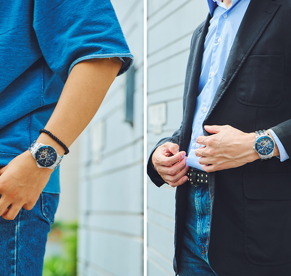 紺ブレザー&サックスブルーのブロードシャツにデニムというアメリカントラッドな組みあわせ。そんな王道スタイルに、スポーティーなステンレススチールのブレスレットモデルが爽快感をプラスします。