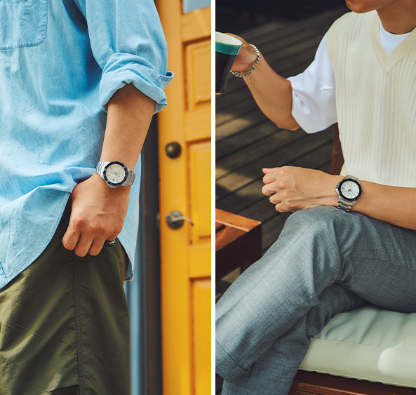 白Tシャツ一枚のスタイルをより洗練されたスタイルへ格上げするのが、ニットベストとのレイヤードテクニック。よりキレイめに着こなすには、グレーのスラックスが相性抜群です。ホワイト&グレーのモノトーンの清潔感と洗練された雰囲気のスタイルには、控えめなホワイトダイヤル&ステンレススチールブレスレットのコンビネーションがマッチします。ブラックのセラミックベゼルがさりげなく腕元のアクセントに。