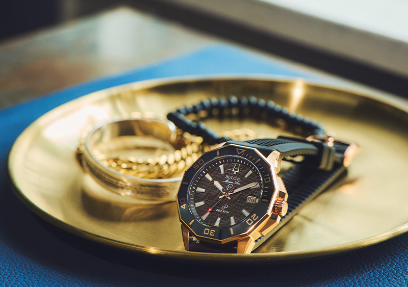 ブローバ独自の高精度ムーブメント“プレシジョニストクォーツ”を搭載した“シリーズC”の1本。12角形のポリゴンケースに艶やかなセラミックのトップリングが特徴的なデザインです。ローズゴールドPVD加工のステンレスケースに、リッチなチョコレートカラーとブラックラバーストラップを合わせることで、スポーツラグジュアリーをいっそう感じます。またラバーストラップには裏側に汗を逃がすように溝が入っており、夏に最適なモデルです。