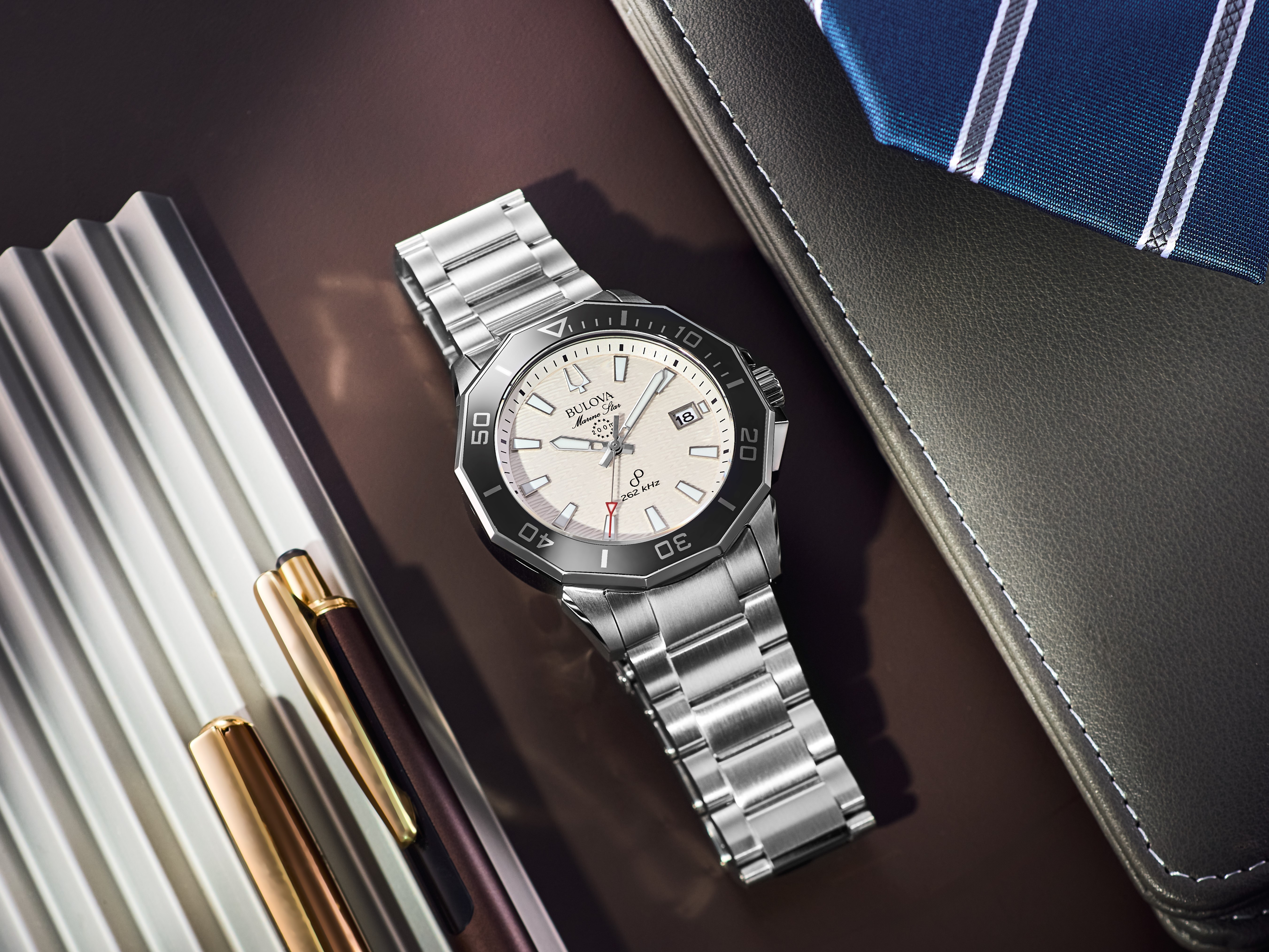ブローバ独自の高精度ムーブメント“プレシジョニストクォーツ”を搭載した“シリーズC”の1本。ステンレスブレスレット仕様にホワイトダイヤルが爽やかな配色。3時位置に日付窓を配したダイヤルには、マリンテイストの時計にふさわしい海の波模様が施され、夏気分を一層感じさせてくれます。20気圧防水、逆回転防止ベゼル、ねじ込み式リューズなど、ダイバーズウォッチに匹敵する本格機能も備えています。