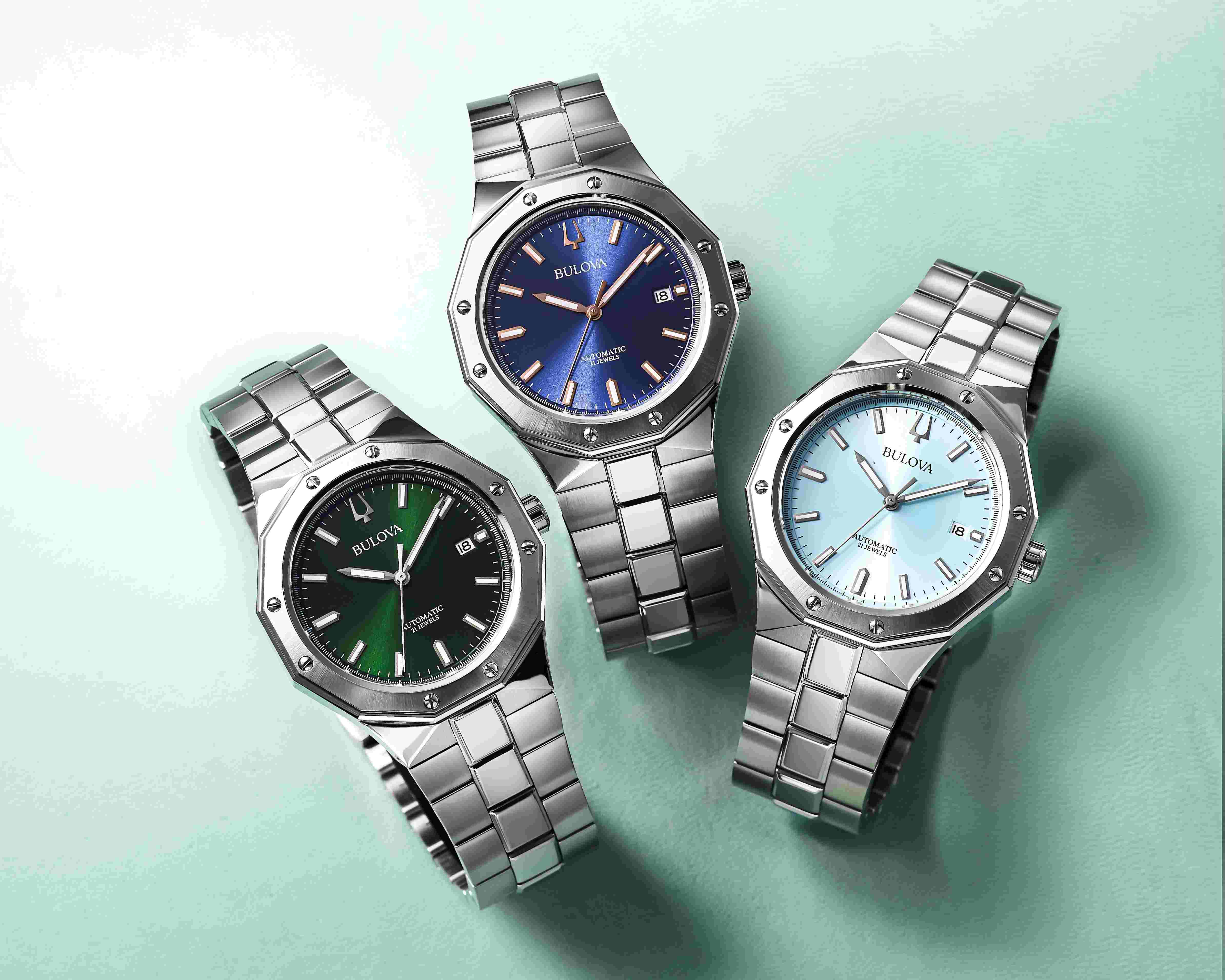 カラーは3色。ダークグリーンとスカイブルーはケースと同色のシルバートーンでまとめ、ミッドナイトブルールは相性のいいローズゴールドトーンを取り入れました。スポーティな要素を取り入れつつ、日常のあらゆるシーンに溶け込む洗練された時計です。