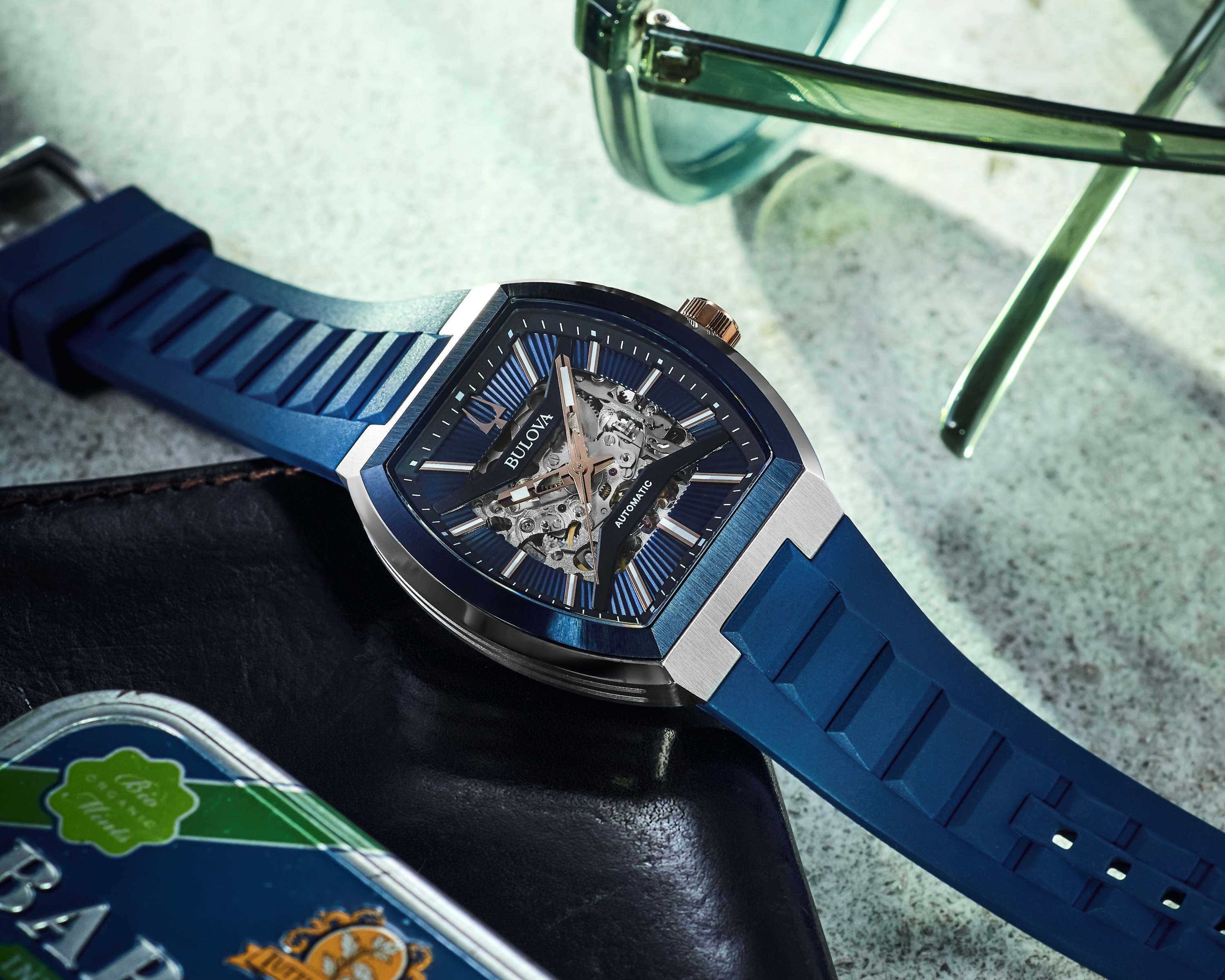 フラットなサファイアクリスタルからは、美しいサンレイ仕上げを施したダイヤルが姿を見せ、光の加減で美しい輝きを放ちます。ダイヤルの12時位置にはブローバの象徴である音叉マークが刻まれ、シンプルにまとめられた針・インデックスが確かな視認性を担保します。