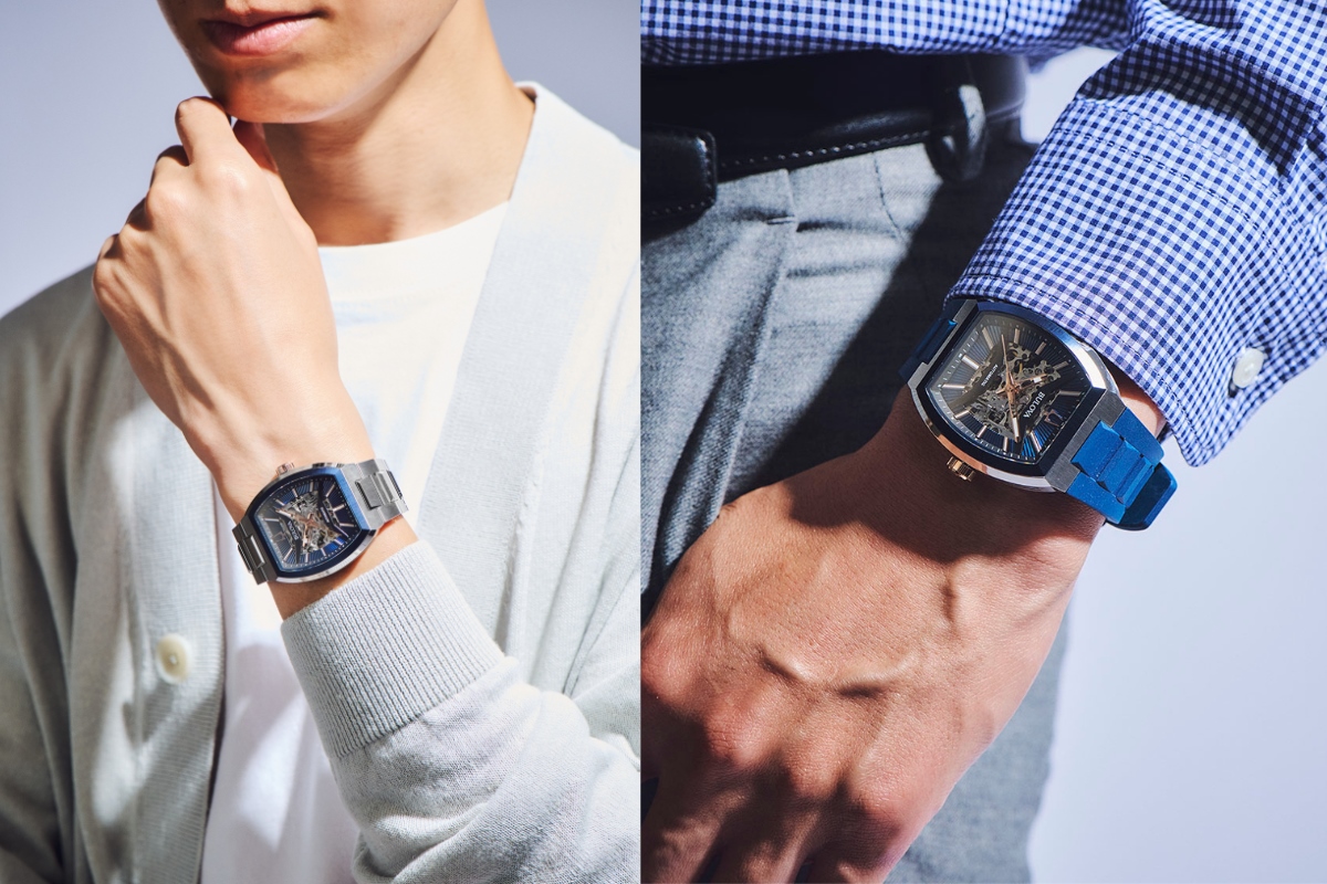 面取り加工を施したとろみのあるブレスレットと、ダイヤルカラーに合わせたラバーストラップの2タイプを用意し、幅広いスタイルにマッチします。