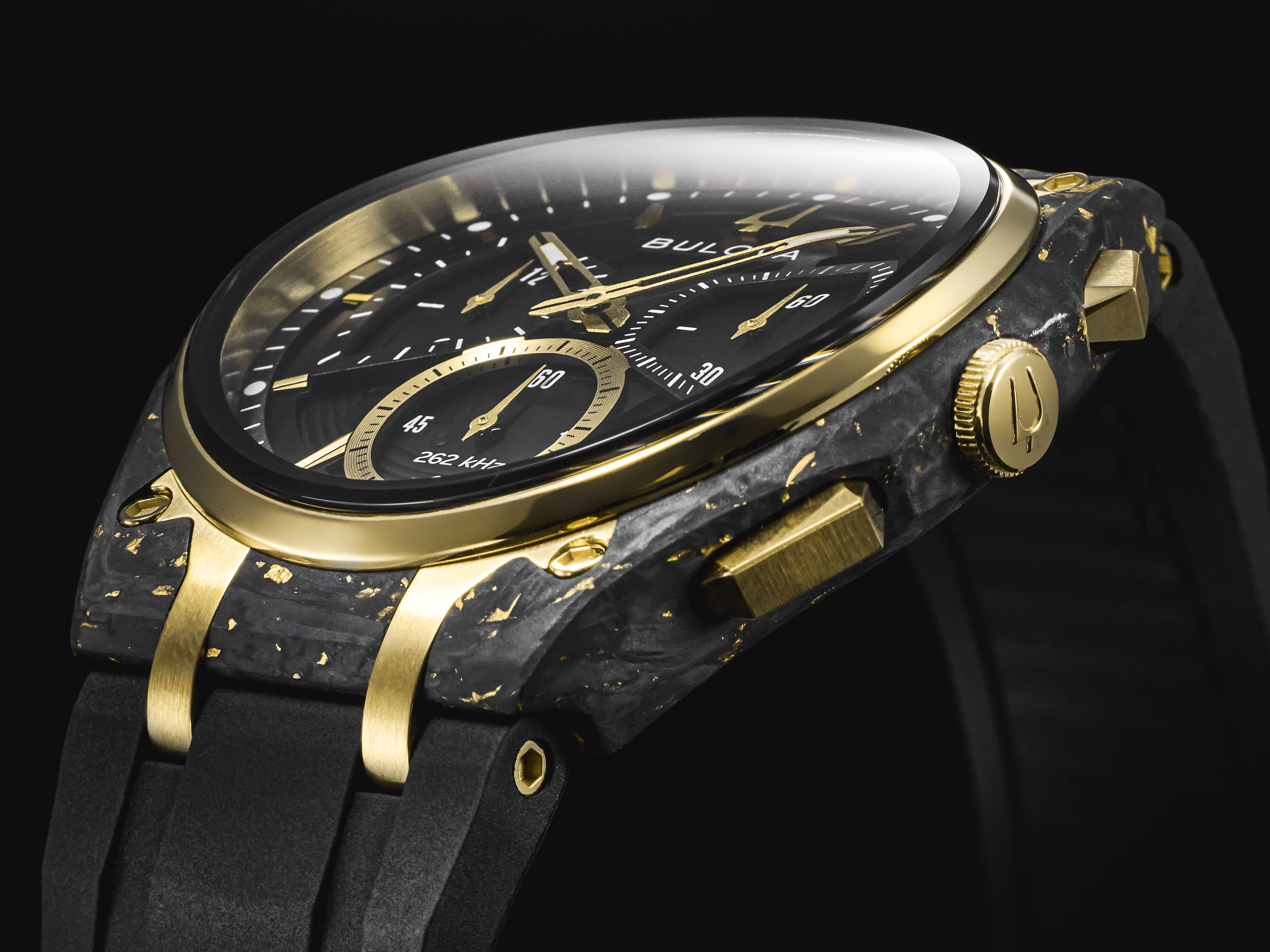 ハイプレシジョンクォーツ、金箔入りフォージドカーボンケース、ラバーストラップ、ケース径44mm、ケース厚10.4mm、3気圧防水、3店舗限定販売【CITIZEN FLAGSHIP STORE TOKYO/ CITIZEN FLAGSHIP STORE OSAKA/ BULOVA公式オンラインストア】